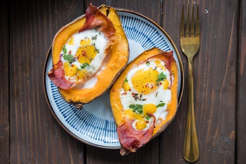 Οι ψητές γλυκοπατάτες γεμιστές με μπέικον, αυγό και λιωμένο τυρί τσένταρ είναι ένα εύκολο και ευέλικτο πιάτο, ιδανικό για χορταστικό πρωινό, brunch, ελαφρύ δείπνο ή ακόμα και μεσημεριανό γεύμα.