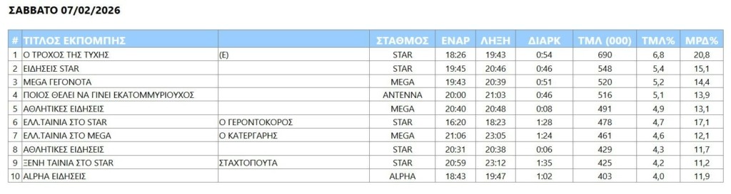 Το Σάββατο, σα συνεννοημένα τα κανάλια, είχαν στα μενού τους, ιδίως τα βραδινά, ταινίες. Το γκελ τους σταθμισμένο, ιδίως των ελληνικών. Απόδειξη, ότι τρεις από τις 10 θέσεις του Top 10 της ημέρας ήταν κατειλημμένες από εκείνες. Κυριάρχησαν, επίσης, τα δελτία ειδήσεων, με πρώτο και καλύτερο το κεντρικό δελτίο του Star.