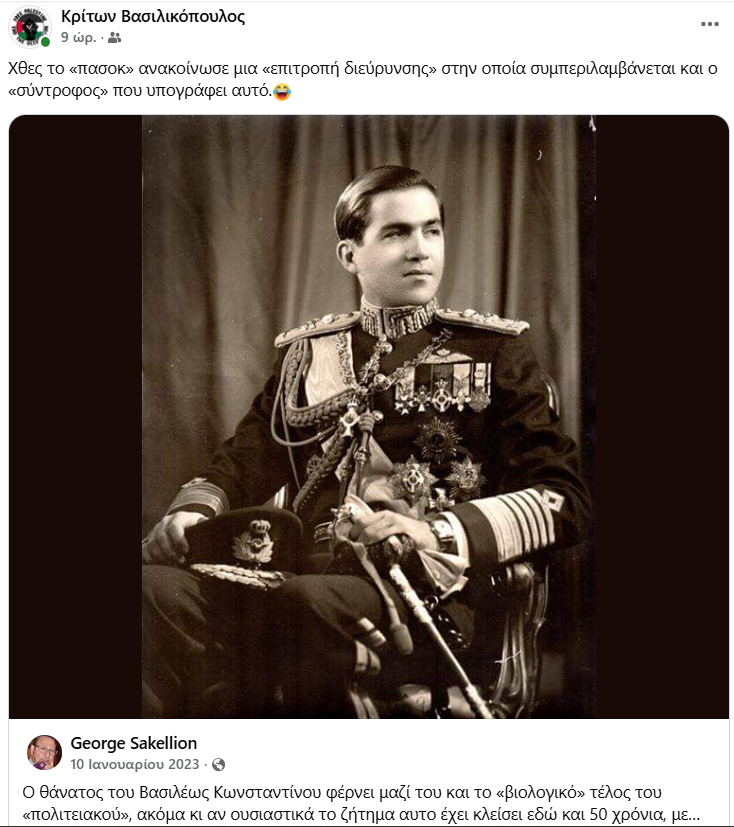 Σε σημείο μάλιστα που να αποθεώνουν, όπως έκανε ο Γιώργος Σακελλίων, τον Κωνσταντίνο Γλύξμπουργκ με ανάρτηση που έκανε όταν ο έκπτωτος με απόφαση του ελληνικού λαού ατυχής μονάρχης, πέθανε το 2023.