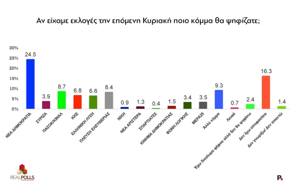 Αντίθετα, η Πλεύση Ελευθερίας χωρίς την κυρία Κωνσταντοπούλου εξαερώνεται: στο 0,9% (από 8,4%). Η Ελληνική Λύση χωρίς τον Κυριάκο Βελόπουλο πέφτει στο 3,3% (από 6,6%), ενώ ο ΣΥΡΙΖΑ χωρίς τον Σωκράτη Φάμελλο ανεβαίνει στο 6,4% (από 3,9%), υποδεικνύοντας ότι και εδώ η ηγεσία λειτουργεί ως τροχοπέδη.