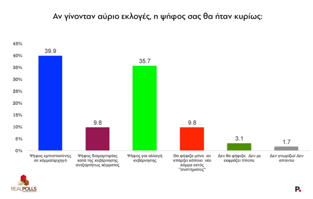 Αυτή η κατανομή αποκαλύπτει ότι σχεδόν ένας στους δύο ψηφοφόρους (45,5%) κινείται είτε από επιθυμία αλλαγής είτε από καθαρή διαμαρτυρία, ενώ μόνο τέσσερις στους δέκα ψηφοφόρους διατηρούν σχέση εμπιστοσύνης με κάποιο υφιστάμενο κόμμα.