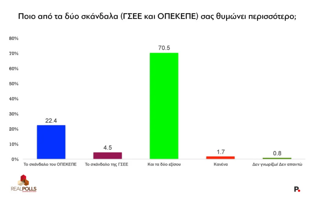 Η νέα δημοσκόπηση περιλαμβάνει για πρώτη φορά ερωτήματα για τα δύο σκάνδαλα που κυριαρχούν στη δημόσια σφαίρα –και τα ευρήματα είναι αποκαλυπτικά. Στην ερώτηση ποιο από τα δύο σκάνδαλα «θυμώνει» περισσότερο τους πολίτες, η απάντηση είναι συντριπτική: το 70,5% δηλώνει «και τα δύο εξίσου», ενώ μόλις το 22,4% εστιάζει αποκλειστικά στο ΟΠΕΚΕΠΕ και ένα 4,5% στη ΓΣΕΕ. Ο κοινός παρονομαστής είναι σαφής: η οργή δεν κατευθύνεται μόνο σε μια κυβέρνηση ή μόνο σε ένα κόμμα, αλλά στο σύνολο ενός πολιτικού συστήματος που αντιμετωπίζεται ολοένα και περισσότερο ως εγγενώς διεφθαρμένο.