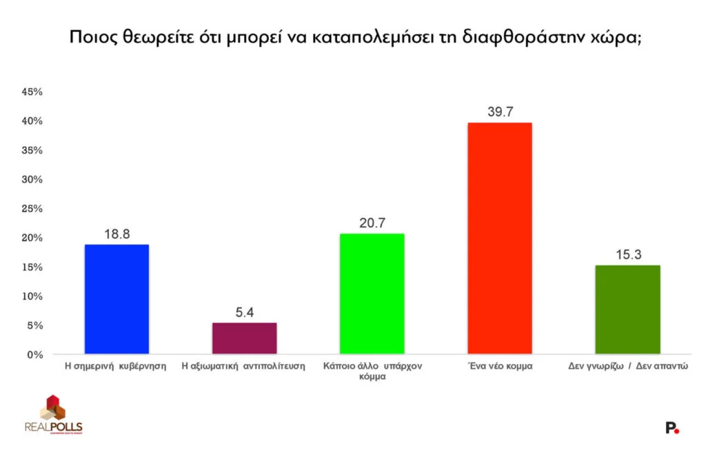 Συνέπεια αυτής της αίσθησης είναι εξίσου ενδεικτική: στην ερώτηση «ποιος μπορεί να καταπολεμήσει τη διαφθορά», το 39,7% απαντά «ένα νέο κόμμα», ενώ μόλις το 18,8% εμπιστεύεται τη σημερινή κυβέρνηση, ένα 20,7% κάποιο άλλο υπάρχον κόμμα, και μόλις το 5,4% την αξιωματική αντιπολίτευση. Η αντιστοιχία αυτής της ερώτησης με εκείνη του Ιανουαρίου, όπου το 43,7% δήλωνε ότι μόνο ένα «νέο κόμμα» μπορεί να βελτιώσει την κατάσταση, επιβεβαιώνει μια σταθερή τάση: η δεξαμενή της δυσαρέσκειας παραμένει μεγάλη, αλλά δεν έχει βρει ακόμα πολιτική έκφραση.