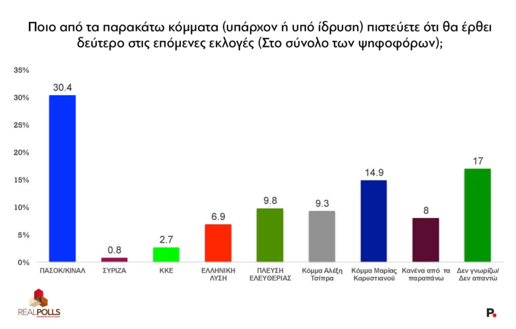 Στο σύνολο, στην ερώτηση «ποιο κόμμα πιστεύετε ότι θα έρθει δεύτερο», το ΠΑΣΟΚ-ΚΙΝΑΛ προηγείται με 30,4%, ακολουθεί το πιθανολογούμενο κόμμα Καρυστιανού με 14,9%, η Πλεύση Ελευθερίας με 9,8% και το κόμμα Τσίπρα είναι πέμπτο με 9,3%. Ωστόσο, πίσω από αυτόν τον μέσο όρο κρύβονται δύο αντιδιαμετρικά τοπία.