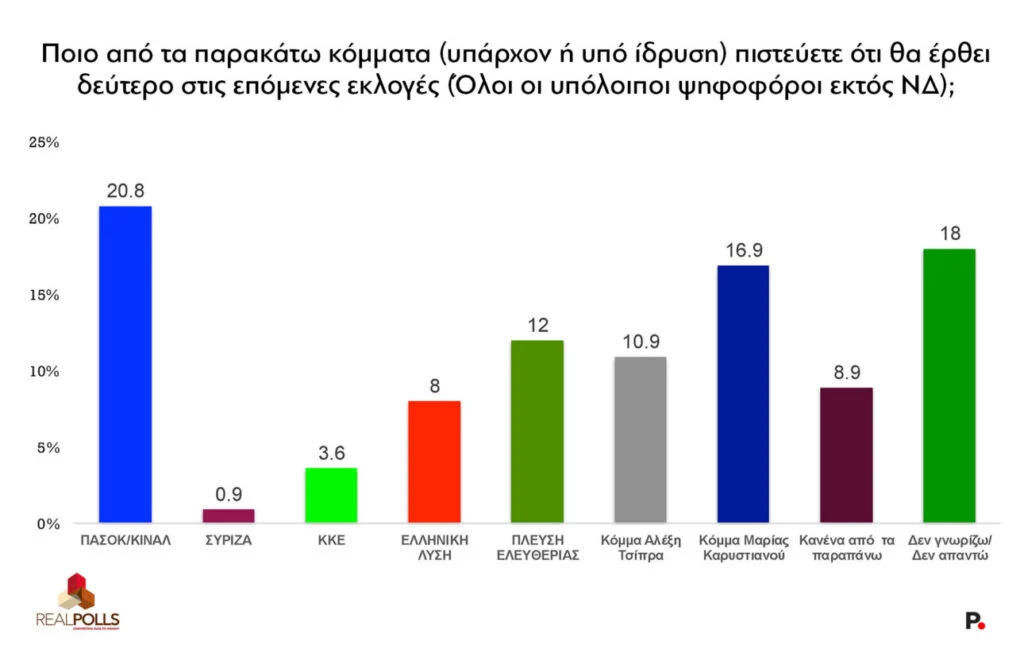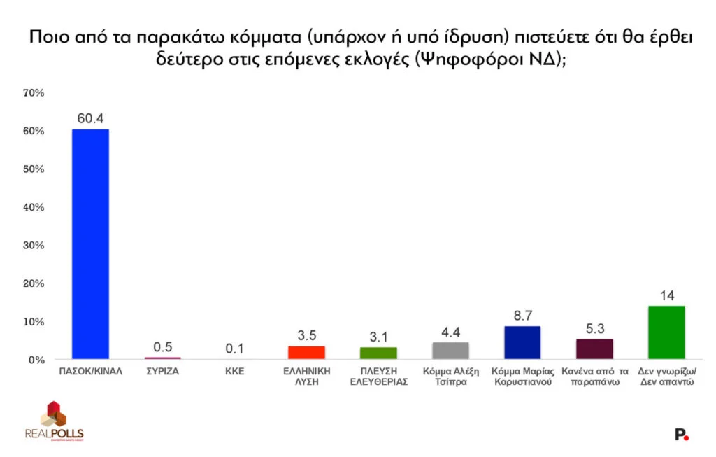 Οι ψηφοφόροι της ΝΔ βλέπουν ΠΑΣΟΚ: Ενα εντυπωσιακό 60,4% των ψηφοφόρων της ΝΔ θεωρεί ότι το ΠΑΣΟΚ θα είναι δεύτερο —ποσοστό που αντανακλά τόσο μια γνωστή πολιτική λογική (οι ψηφοφόροι της Δεξιάς-Κεντροδεξιάς «βλέπουν» ως κύριο αντίπαλο ένα κόμμα του Κέντρου και της Κεντροαριστεράς) όσο και μια ρεαλιστική εκτίμηση ότι ο αντισυστημικός κατακερματισμός δεν θα επιτρέψει σε κανένα αντισυστημικό σχηματισμό να αναδειχθεί. Το κόμμα Καρυστιανού μετρά μόλις 8,7% μεταξύ αυτών, το κόμμα Τσίπρα 4,4%, και η Πλεύση Ελευθερίας μόλις 3,1%. Η εικόνα, με άλλα λόγια, είναι εικόνα μιας κλασικής δικομματικής αντιπαράθεσης ΝΔ-ΠΑΣΟΚ.