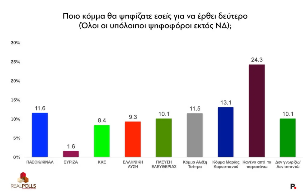 Μεταξύ ψηφοφόρων ΝΔ, η υπεροχή του ΠΑΣΟΚ είναι συντριπτική: 50,6% θα το ψήφιζε για δεύτερο, ακολουθεί η Ελληνική Λύση με μόλις 6,7%, και το κόμμα Καρυστιανού μόλις στο 4,7% –ένα ενδιαφέρον εύρημα που δείχνει τον μικρό βαθμό διείσδυσης του τελευταίου στην παράταξη της Νέας Δημοκρατίας. Το κόμμα Τσίπρα και η Πλεύση Ελευθερίας μετρούν μόλις 1% ο καθένας. Αξιοσημείωτο είναι το γεγονός ότι ένα 28,7% απαντά «κανένα από τα παραπάνω» —σημάδι ότι σημαντικό μέρος των ψηφοφόρων της ΝΔ δεν θέλει κανέναν ανταγωνιστή, ή θεωρεί ότι καμία αντιπολίτευση δεν αξίζει.