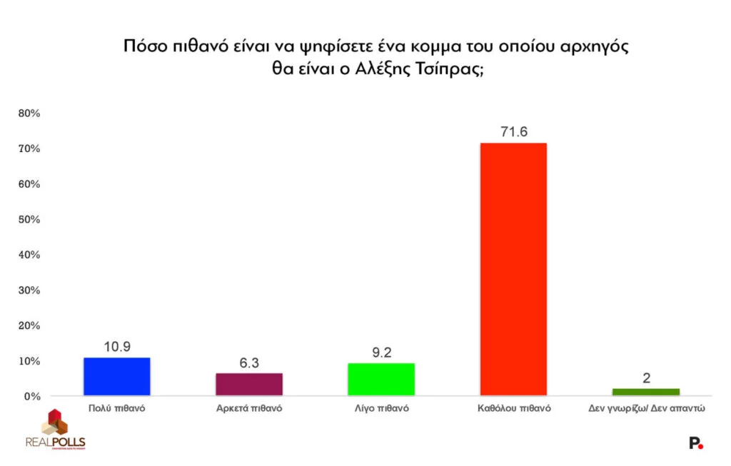 Στην ερώτηση «πόσο πιθανό είναι να ψηφίσετε ένα κόμμα του οποίου αρχηγός θα είναι ο Αλέξης Τσίπρας», τα αποτελέσματα δείχνουν μια μικρή ανακατανομή: 10,9% απαντά «πολύ πιθανό» (από 4,6% τον Ιανουάριο) και 6,3% «αρκετά πιθανό» (από 11,4%), με αποτέλεσμα το συνολικό «ταβάνι» να ανεβαίνει λίγο, στο 17,2% (από 16% τον Ιανουάριο). Η σημαντική αλλαγή, όμως, είναι ότι το «καθόλου πιθανό» αυξήθηκε στο 71,6% (από 67,9%), σηματοδοτώντας μια σκλήρυνση της αρνητικής στάσης: ο πρώην πρόεδρος του ΣΥΡΙΖΑ φαίνεται να κρατά ένα μικρό αλλά σταθερό πυρήνα υποστηρικτών, ωστόσο η ευρύτερη κοινωνική απόρριψη μεγεθύνεται.