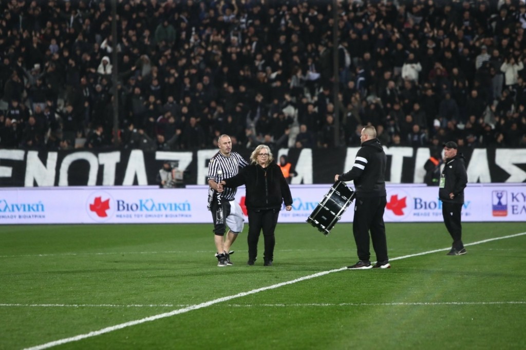 Σήμερα, στον αγωνιστικό χώρο βρέθηκε μια μαυροφορεμένη γυναίκα, η οποία ανέλαβε να δώσει τον ρυθμό στην κερκίδα.