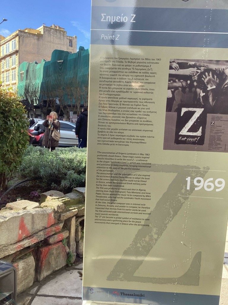 Μετά από απόφαση του Δημοτικού Συμβουλίου του Δήμου Θεσσαλονίκης, το σημείο δολοφονίας του βουλευτή Γρηγόρη Λαμπράκη, έλαβε τον χαρακτηρισμό του «Δείκτη μνήμης-σημείο Ζ», αφού το όλο περιστατικό περιγράφηκε από το βιβλίο του Βασίλη Βασιλικού, το «Ζ», ενώ ο Κώστας Γαβράς ανέλαβε την ομότιτλη μεταφορά του στη μεγάλη οθόνη. Για τον λόγο τούτο, ο Δήμος Θεσσαλονίκης προσκάλεσε τον ενενηντατριάχρονο, πλέον, σκηνοθέτη να παραστεί στην επίσημη παρουσίαση του σημείου «Ζ».