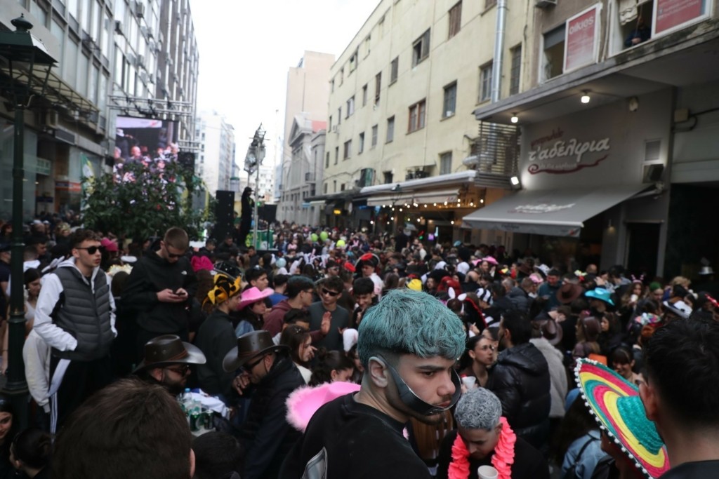 Από τις 2 το μεσημέρι έχει κλείσει η Βασιλέως Ηρακλείου και στο σημείο επικρατεί το αδιαχώρητο, με κόσμο να διασκεδάζει με αποκριάτικες στολές και να απολαμβάνει νόστιμα εδέσματα.