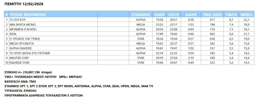 Τσίκνισε στην κορυφή της τηλεθέασης ο Alpha (12/2)