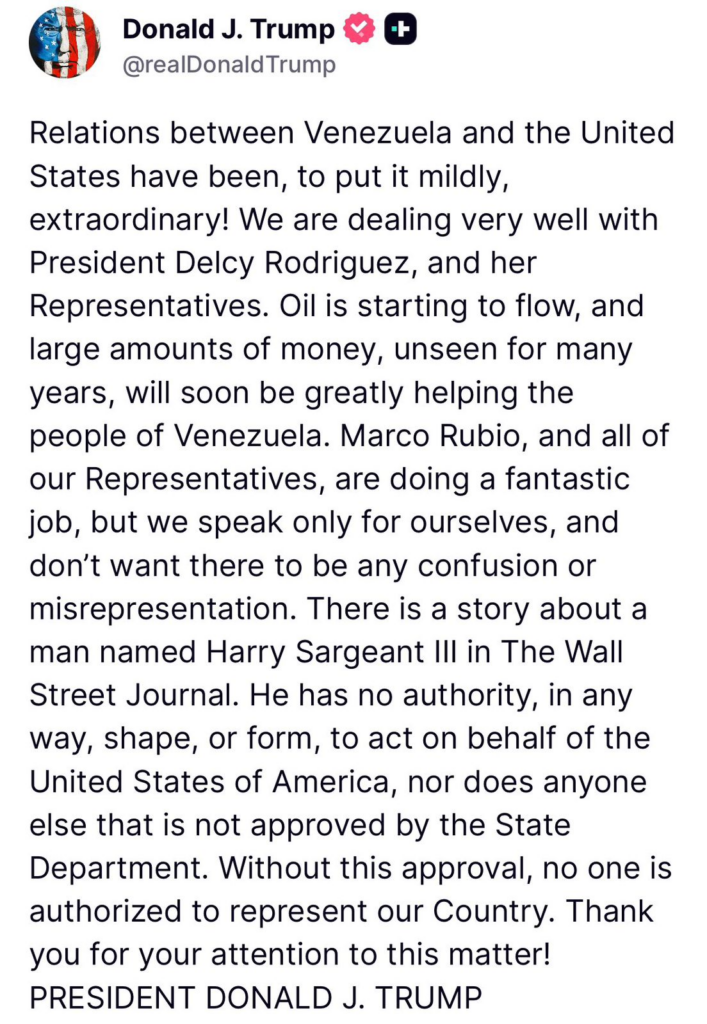 Ο πρόεδρος των ΗΠΑ Ντόναλντ Τραμπ χαρακτήρισε για άλλη μια φορά «πολύ καλή» τη σχέση της Ουάσινγκτον με τη Βενεζουέλα, διευκρινίζοντας ότι αναγνωρίζει ως επίσημη κυβέρνηση της χώρας εκείνη της προσωρινής προέδρου Ντέλσι Ροντρίγκες, πρώην αντιπροέδρου του Νικολάς Μαδούρο.