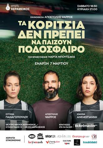 Την παράσταση «Τα κορίτσια δεν πρέπει να παίζουν ποδόσφαιρο» της βραβευμένης Μάρτα Μπουτσάκα θα έχει την ευκαιρία να παρακολουθήσει το κοινό, από τις 7 Μαρτίου 2026, στο Θέατρο Μικρός Κεραμεικός, τα Σάββατα στις 18:30 και τις Κυριακές 21:00.