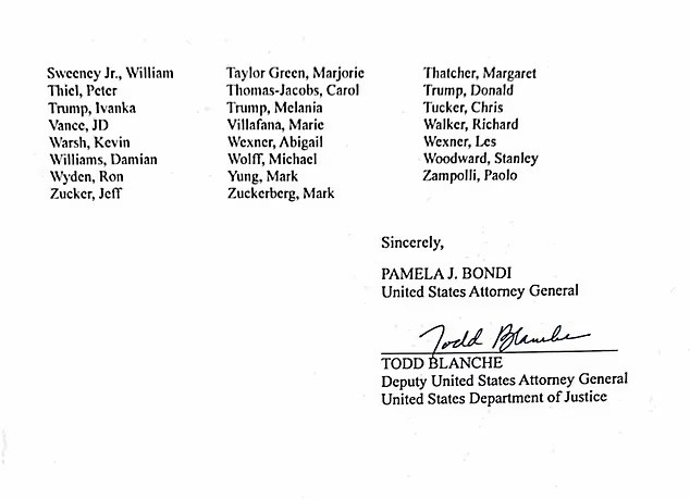 Η Γενική Εισαγγελέας Παμ Μπόντι αποκάλυψε κατάλογο με 305 επιφανείς προσωπικότητες – μεταξύ των οποίων οι Ντόναλντ Τραμπ, Μπιλ Γκέιτς και Κιμ Καρντάσιαν – που εμφανίζονται στα λεγόμενα αρχεία Έπσταϊν.