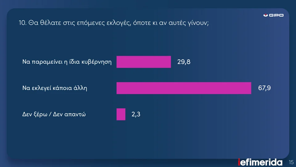 Στις αμιγώς πολιτικές ερωτήσεις αποτυπώνεται ένα ποσοστό της τάξης του 29,8% που θα ήθελε την παρούσα κυβέρνηση να συνεχίζει και μετά τις επόμενες εκλογές, έναντι μιας μεγάλης πλειοψηφίας με 67,9% που θα επιθυμούσε πολιτική αλλαγή. Το πρόβλημα με αυτό το 67,9% είναι ότι επί της ουσίας είναι πολυδιασπασμένο, χωρίς πολιτική κατεύθυνση και στόχευση. Στον αντίποδα, το κυβερνητικό 29,8% περιγράφει και αποτυπώνει έναν συμπαγή πολιτικό πυρήνα.