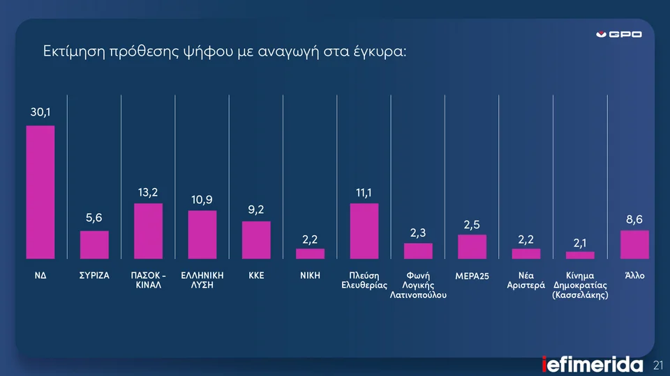 Στην εκτίμηση ψήφου με αναγωγή στα έγκυρα η ΝΔ συγκεντρώνει 30,1%, με τη διαφορά από το δεύτερο ΠΑΣΟΚ με 13,2, να διαμορφώνεται στο 16,9%. Στην τρίτη θέση βρίσκεται η Πλεύση Ελευθερίας με 11,1% και την ακολουθεί η Ελληνική Λύση με 10,9%. Στην πέμπτη θέση είναι το ΚΚΕ με 9,2%, ενώ ο ΣΥΡΙΖΑ είναι έκτο κόμμα με 5,6%.