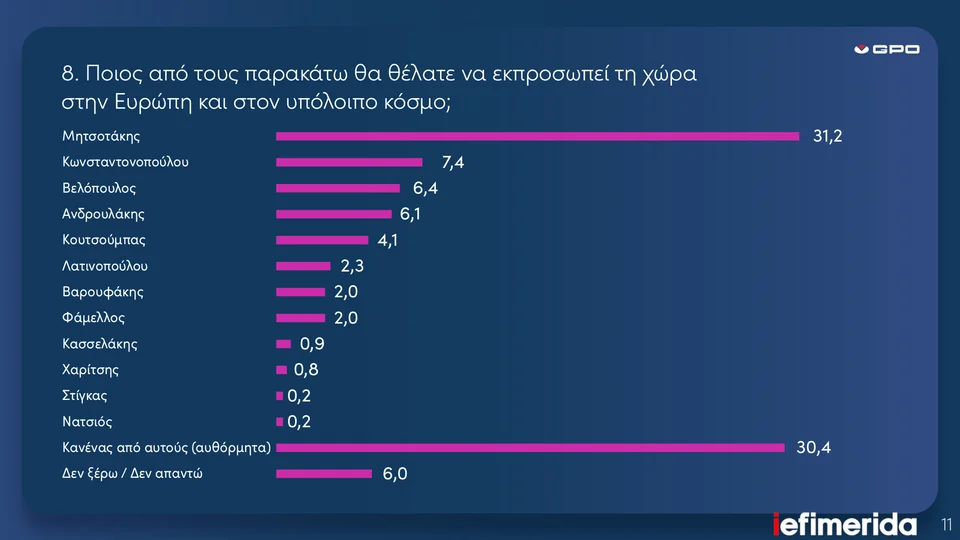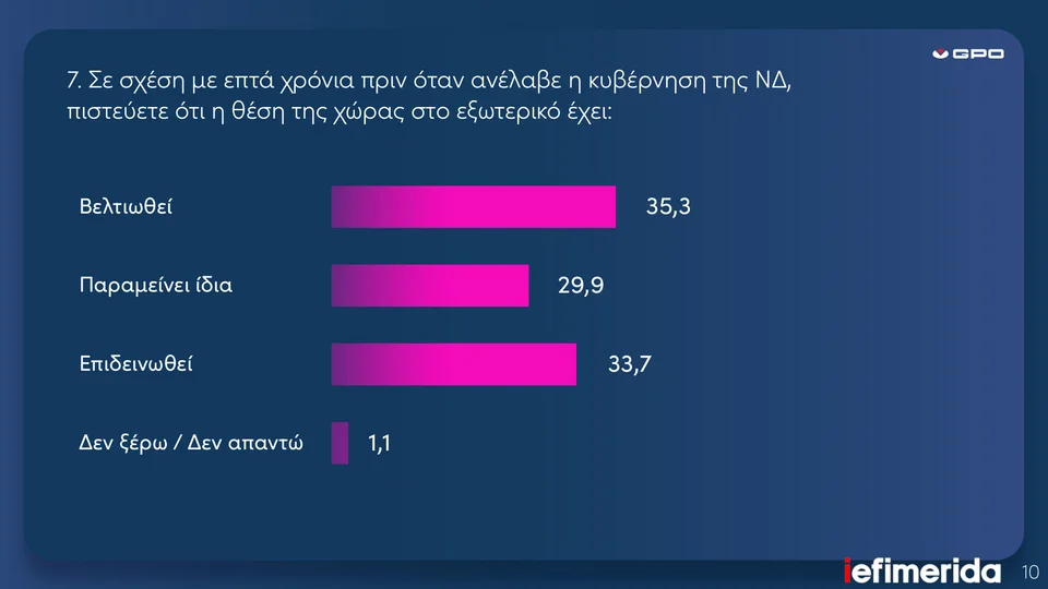Συνολικά, η εξωτερική πολιτική της κυβέρνησης αποτιμάται θετικά από το 38,9% των πολιτών, ενώ ο Έλληνας πρωθυπουργός, σε ποσοστό 31,2%, θεωρείται ως ο καλύτερος εκπρόσωπος αυτή τη στιγμή της χώρας στα διεθνή φόρα. .