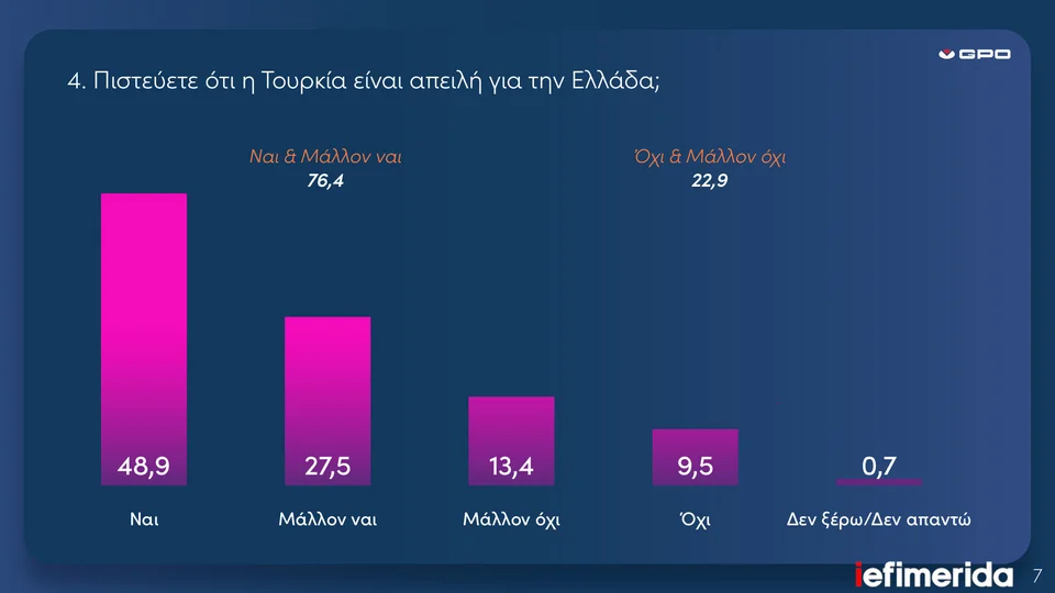 Την ίδια στιγμή, βέβαια, το 57,6% πιστεύει ότι η χώρα μας πρέπει να ακολουθήσει μια πιο διεκδικητική πολιτική έναντι της Τουρκίας, την οποία η πλειοψηφία σε ποσοστό 76,4% συνεχίζει να θεωρεί ως μια χώρα απειλητική για τα ελληνικά συμφέροντα.
