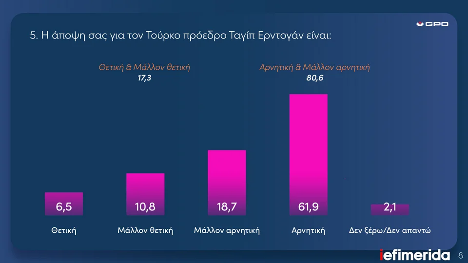 Είναι σαφές ότι, τουλάχιστον σε επίπεδο κοινής γνώμης, δεν έχουν οικοδομηθεί τα απαραίτητα μέτρα εμπιστοσύνης και ενδεικτικό ως προς αυτό είναι και το χαμηλό ποσοστό δημοφιλίας του προέδρου Ερντογάν, που καταγράφεται μόλις στο 17,3%.