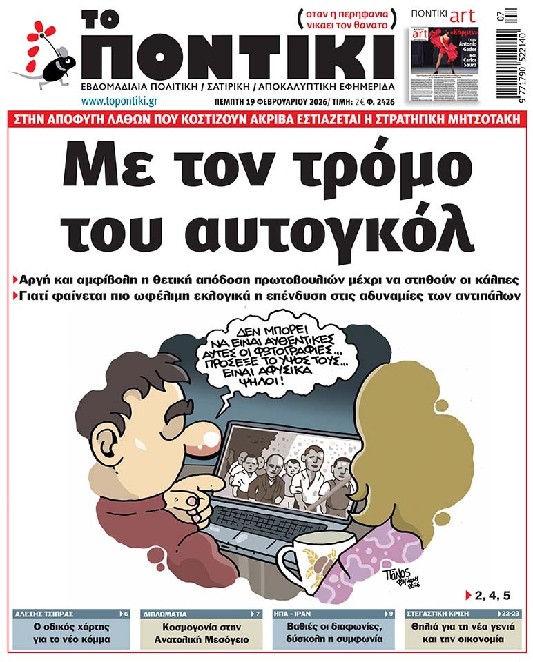 Με πρωτοσέλιδο τίτλο «Με τον τρόμο του αυτογκόλ» και αναλυτικό – αποκαλυπτικό ρεπορτάζ για την στρατηγική Μητσοτάκη που εστιάζεται στην αποφυγή λαθών που κοστίζουν ακριβά, καθώς είναι αργή και αμφίβολη η θετική απόδοση πρωτοβουλιών μέχρι να στηθούν οι κάλπες, αλλά και γιατί φαίνεται πιο ωφέλιμη εκλογικά η επένδυση στις αδυναμίες των αντιπάλων, κυκλοφορεί το «ΠΟΝΤΙΚΙ» το πρωί της Πέμπτης.