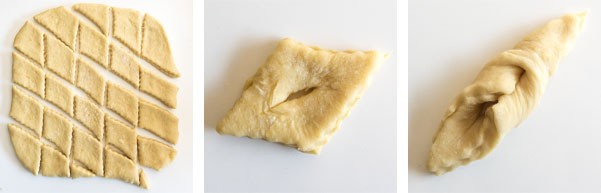 4. Με το μαχαίρι κάντε μια σχισμή στο κέντρο κάθε ρόμβου, πιάστε τη μια άκρη της ζύμης και περάστε την μέσα από την τρύπα, φτιάχνοντας τα αυτάκια (ωτία).
