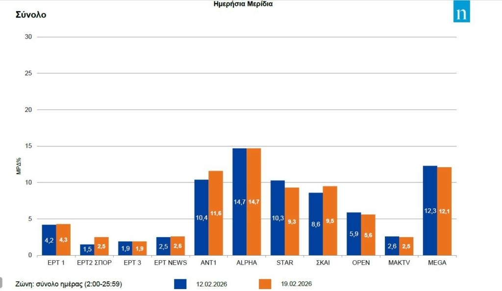 Κέρδη (1,6%) εμφάνισε ο ΣΚΑΪ και προσπέρασε το STAR παρότι καταγράφηκε και σε εκείνο τάση ανόδου. Θετικό πρόσημο εμφάνισε το Open, αλλά και η ΕΡΤ1 με ίδια ακριβώς μεταβολή (0,3%).