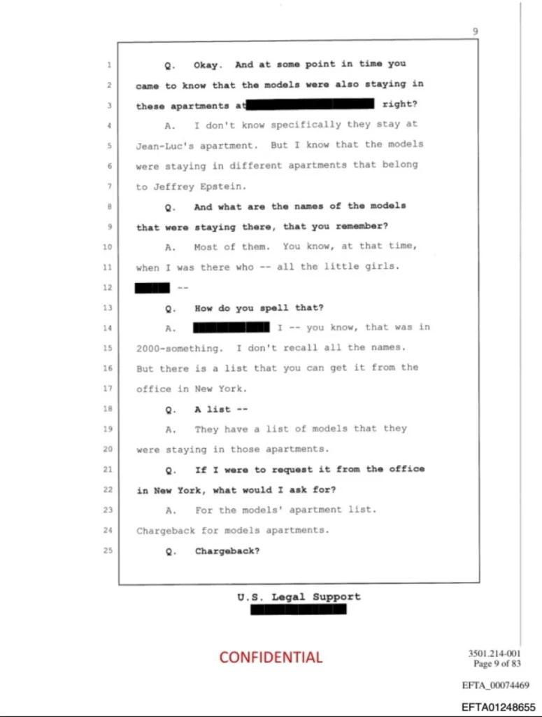 Η υπόθεση αποκαλύπτει πώς ο Επστάιν αξιοποίησε τον πλούτο και τις διασυνδέσεις του για να διεισδύσει, μεταξύ άλλων, στον χώρο της μόδας, διαμορφώνοντας ένα δίκτυο στρατολόγησης και ελέγχου νεαρών γυναικών. Όπως δήλωσε ο δικηγόρος Μπραντ Έντουαρντς, που εκπροσώπησε περισσότερα από 200 θύματα, «(ο Επστάιν) βρήκε στον Ζαν Λυκ έναν ομοϊδεάτη θηρευτή με τον οποίο μπορούσε να συνωμοτεί καθημερινά για να στρατολογεί και να ελέγχει τις ζωές αμέτρητων νεαρών γυναικών».
