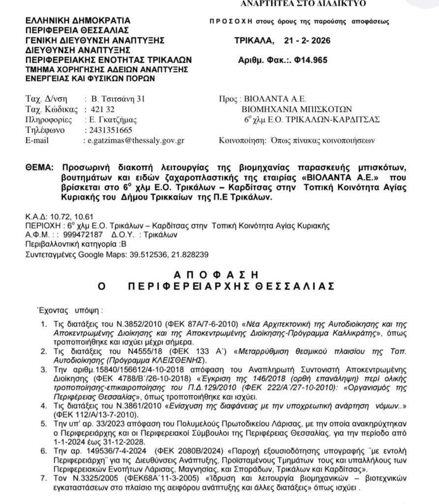 «Διακόπτουμε προσωρινά τη λειτουργία της βιομηχανίας της εταιρίας “Βιολάντα”, που βρίσκεται στο 6ο χλμ Ε.Ο Τρικάλων – Καρδίτσας στην Τοπική Κοινότητα Αγίας Κυριακής του Δήμου Τρικκαίων της Π.Ε. Τρικάλων και συγκεκριμένα του μηχανολογικού εξοπλισμού της παραγωγικής διαδικασίας (γραμμές παραγωγής και εγκαταστάσεις υγραερίου) σύμφωνα με το άρθρο 29 παρ. 1 και 2 του Ν. 3982/2011 επειδή κρίνουμε ότι προκαλείται άμεσος κίνδυνος για την ασφάλεια των εγκαταστάσεων και τον εργαζομένων σύμφωνα με τα σχετικά έγγραφα 17, 18, 19 και συγκεκριμένα απαιτείται:
