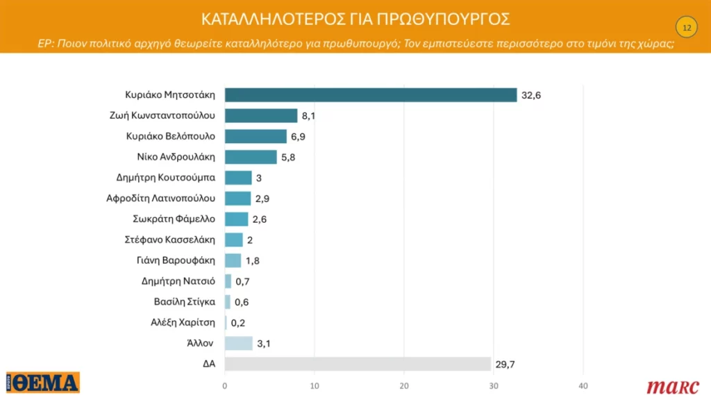 Σύμφωνα με δημοσκόπηση, ο πρωθυπουργός Κυριάκος Μητσοτάκης εμφανίζεται με αυξημένα ποσοστά (+1,4 μονάδες) στην καταλληλότητα για την πρωθυπουργία, με Ζωή Κωνσταντοπούλου να ακολουθεί με 8,1.