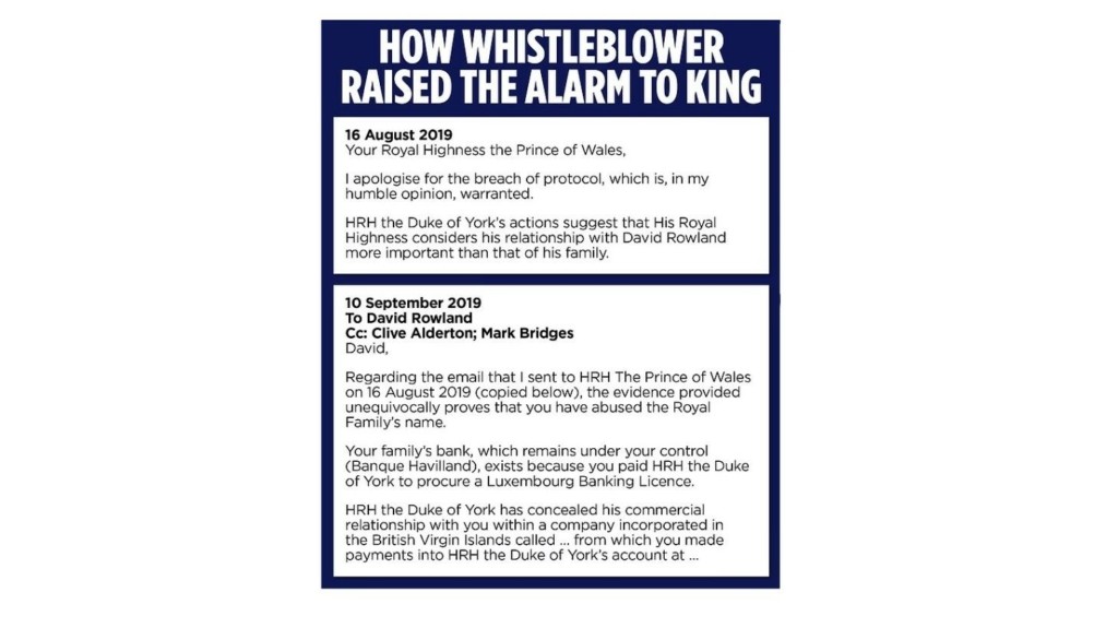 Σύμφωνα με το δημοσίευμα της βρετανικής εφημερίδας, ο καταγγέλλων απέστειλε και δεύτερο email απευθείας στον Rowland, κοινοποιώντας το στον ιδιωτικό γραμματέα του Καρόλου, Clive Alderton, και στον νομικό της αείμνηστης Βασίλισσας, Mark Bridges.