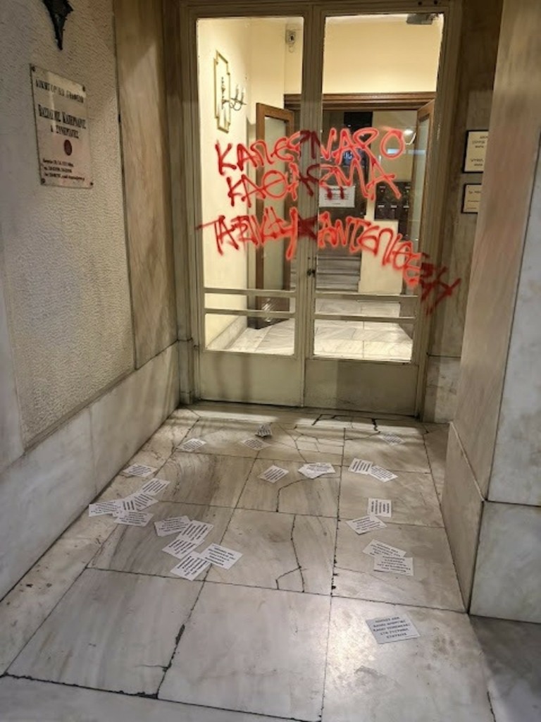 Συγκεκριμένα, στις σχετικές φωτογραφίες φαίνονται συνθήματα με κόκκινο σπρέι και τρικάκια, που βρέθηκαν στην είσοδο της πολυκατοικίας, όπου στεγάζεται το δικηγορικό του γραφείο.