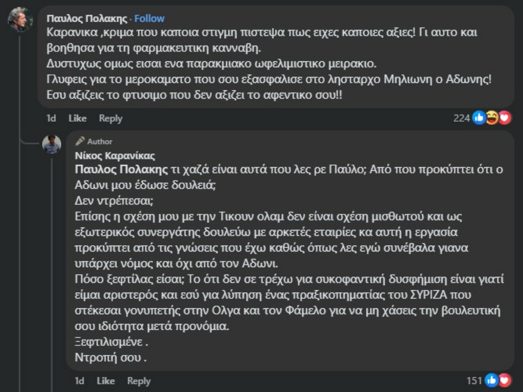 Παράλληλα, ο Παύλος Πολάκης άφησε αιχμές για την επαγγελματική δραστηριότητα του Νίκου Καρανίκα στον χώρο της φαρμακευτικής κάνναβης.