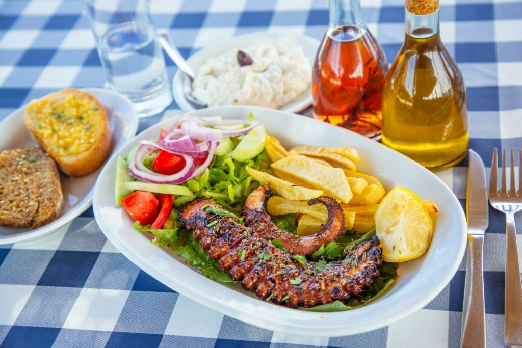 Τα θαλασσινά είναι το στοιχείο που δίνει γιορτινό χαρακτήρα. Χταπόδι ψητό ή ξιδάτο, καλαμαράκια τηγανητά, γαρίδες, θράψαλα και μύδια συνθέτουν την κλασική εικόνα.