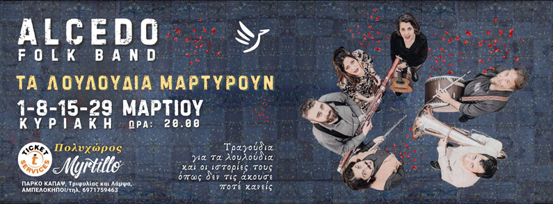 Προπώληση: https://www.ticketservices.gr/event/myrtilo-cafe-alcedo-folk-band-ta-loyloyia-martyroyn/?lang=el