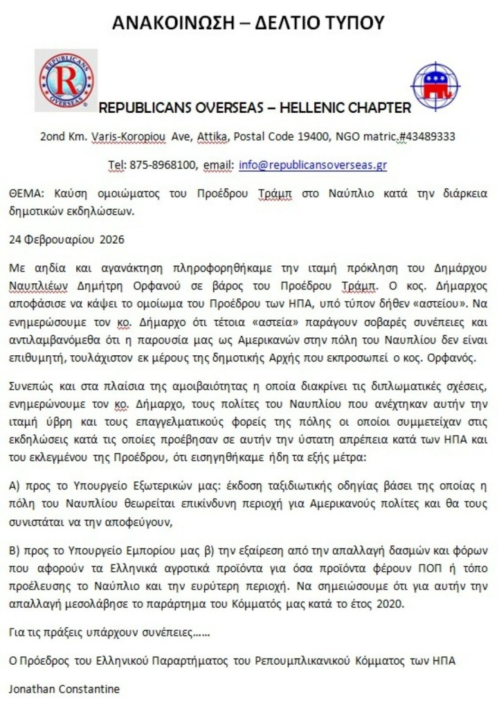 Παράλληλα, αναφέρει ότι προτίθεται να απευθυνθεί στις αρμόδιες αμερικανικές Αρχές, ζητώντας την έκδοση ταξιδιωτικής οδηγίας για το Ναύπλιο, καθώς και την επανεξέταση εμπορικών ρυθμίσεων που σχετίζονται με προϊόντα της περιοχής.
