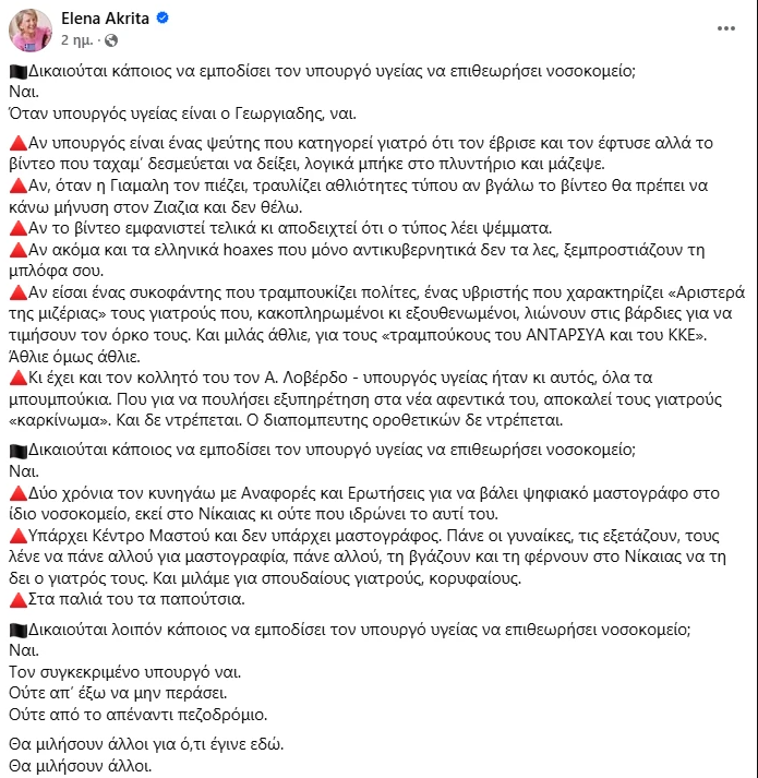 Νωρίτερα, η Έλενα Ακρίτα τάχθηκε υπέρ των γιατρών, λέγοντας ότι τον συγκεκριμένο υπουργό δικαιούνταν να τον εμποδίσουν.