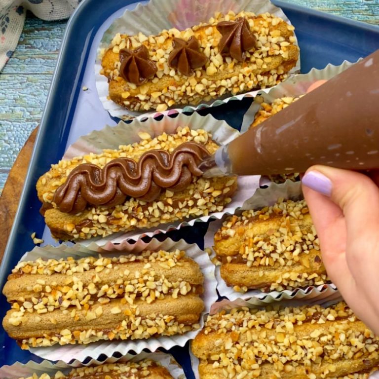 5. Βουτήξτε το σαντουιτσάκι γρήγορα στον κρύο καφέ και στη συνέχεια κυλήστε το απο όλες τις πλευρές στα ψιλοκομμένα φουντούκια. Συνεχίστε αυτή τη διαδικασία με τα υπόλοιπα σαβουαγιαρ.