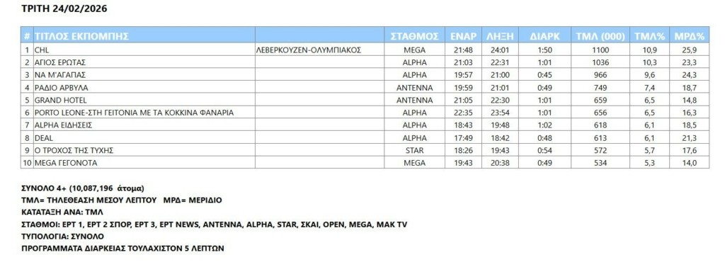 Το Mega «έδειχνε» το «δίχως αύριο» ματς Λεβερκούζεν- Ολυμπιακός για το CHL και περίπου την ίδια ώρα ο δείκτης της Nielsen «έδειχνε» σχεδόν την ίδια τηλεθέαση στην απευθείας μετάδοση της ευρωπαϊκής ποδοσφαιρικής αναμέτρησης και στο επεισόδιο της σειράς «Άγιος έρωτας», που προβάλλεται στο Alpha.
