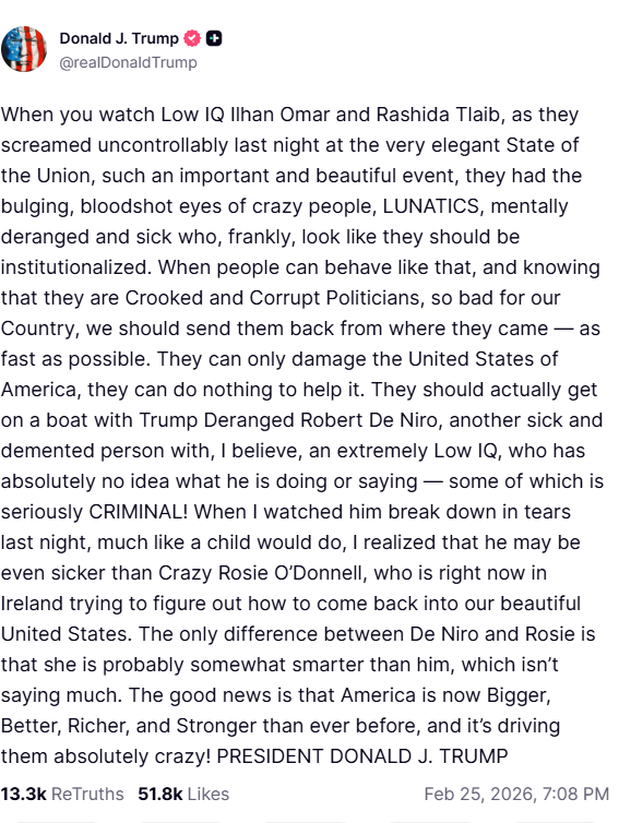 Ο Τραμπ σε ανάρτηση του στο Truth Social είπε ότι ο Ντε Νίρο θα πρέπει να αποχωρήσει από τη χώρα μαζί με τους βουλευτές της Βουλής των Αντιπροσώπων Ιλχάν Όμαρ και Ρασίντα Τάιμπ, που του απάντησαν κατά τη διάρκεια της ομιλίας του.