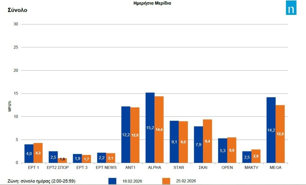 Η σημαντικότερη μεταβολή από την Τρίτη στην Τετάρτη καταγράφηκε στο Alpha (-2,1%) και η αμέσως επόμενη στο Mega (-2%). O ΑΝΤ1 πρόσθεσε στο μερίδιο του από τη μία ημέρα στην άλλη μιάμιση ποσοστιαία μονάδα.