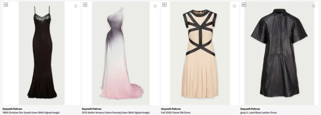 Η ηθοποιός και ιδρύτρια του lifestyle brand Goop είναι γνωστή για τις στιλιστικές της επιλογές και τα πολυτελή κομμάτια που φορά, καθιστώντας την fashion icon για πολλούς. Ως εκ τούτου, η δημοπρασία αναμένεται να προσελκύσει πλήθος κόσμου.