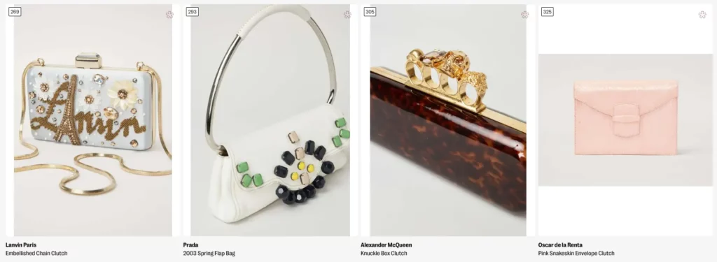Η δημοπρασία περιλαμβάνει επίσης τσάντες, όπως μια μεγάλη Saint Laurent duffel με τρέχουσα προσφορά 350 δολάρια, ρολόγια, κοσμήματα και μία Louis Vuitton τσάντα, με τιμή εκκίνησης 650 δολάρια.