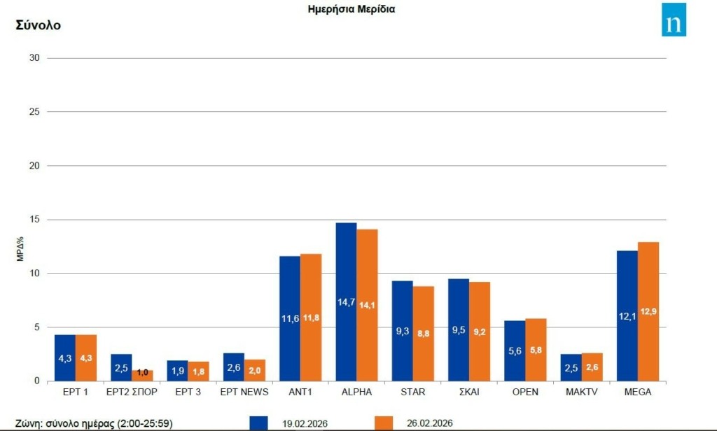 Ελάχιστη διαφορά (-0,3%) είχε την Πέμπτη το μερίδιο του Alpha από εκείνο της προηγούμενης ημέρας, ένδειξη σταθερότητας στις προτιμήσεις των τηλεθεατών, όπως προκύπτει από τα δεδομένα της καθημερινής δυναμομέτρησης των τηλεοπτικών σταθμών από τη Nielsen.