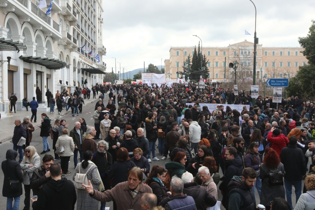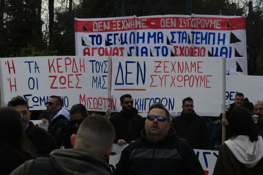 Η εξέδρα για τη μεγάλη πορεία των τριών χρόνων από την τραγωδία στα Τέμπη έχει στηθεί στην πλατεία Συντάγματος, όπου στις 12:00 το άρχισε η κεντρική συγκέντρωση στην Αθήνα.