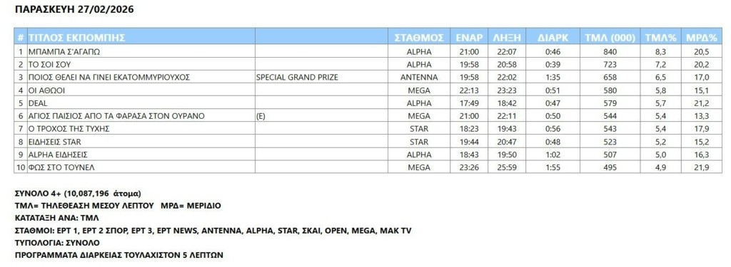 Mega: «Έσπασε» το σερί παραμονής του Alpha στην κορυφή της τηλεθέασης την Παρασκευή (27/2)