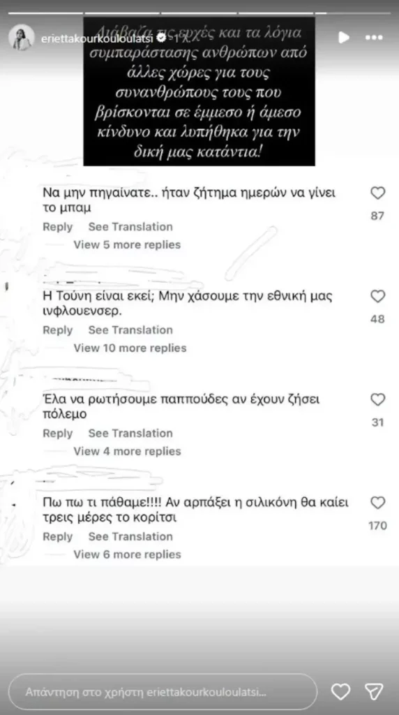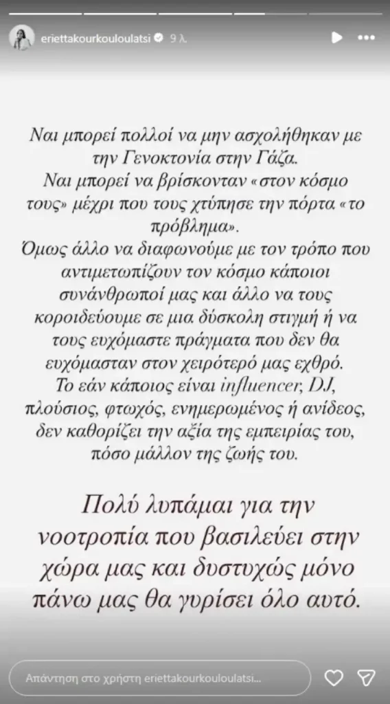 «Διάβαζα ευχές και τα λόγια συμπαράστασης ανθρώπων από άλλες χώρες για τους συνανθρώπους τους που βρίσκονται σε έμμεσο ή άμεσο κίνδυνο και λυπήθηκα για την δική μας κατάντια!» έγραψε αρχικά η Εριέττα Κούρκουλου.