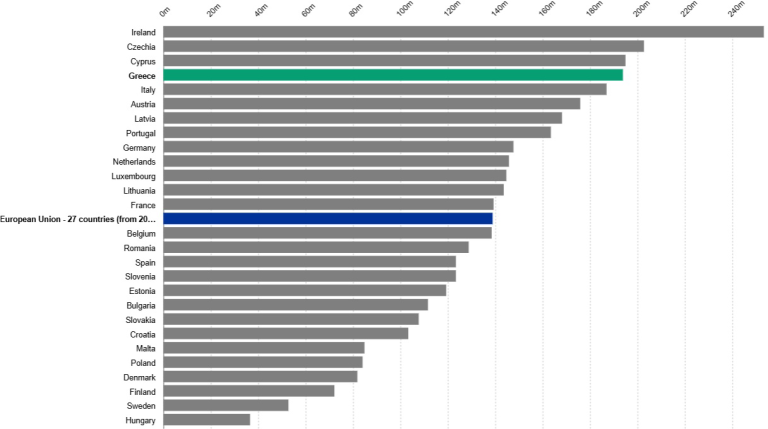 Τέλος, το Ινστιτούτο υπογραμμίζει ότι «απομονώνοντας το καθαρό κόστος ηλεκτρικής ενέργειας και προμήθειας, διαπιστώνουμε ότι το ρεύμα, ως προϊόν, είναι 11% ακριβότερο στη Ελλάδα σε σχέση με τον ευρωπαϊκό μέσο όρο. Όταν μάλιστα συνυπολογιστεί η αγοραστική δύναμη, η πραγματική επιβάρυνση εκτινάσσεται στο +40% έναντι του ευρωπαϊκού μέσου όρου, με την Ελλάδα να καταλαμβάνει την 4η ακριβότερη θέση της Ε.Ε.».