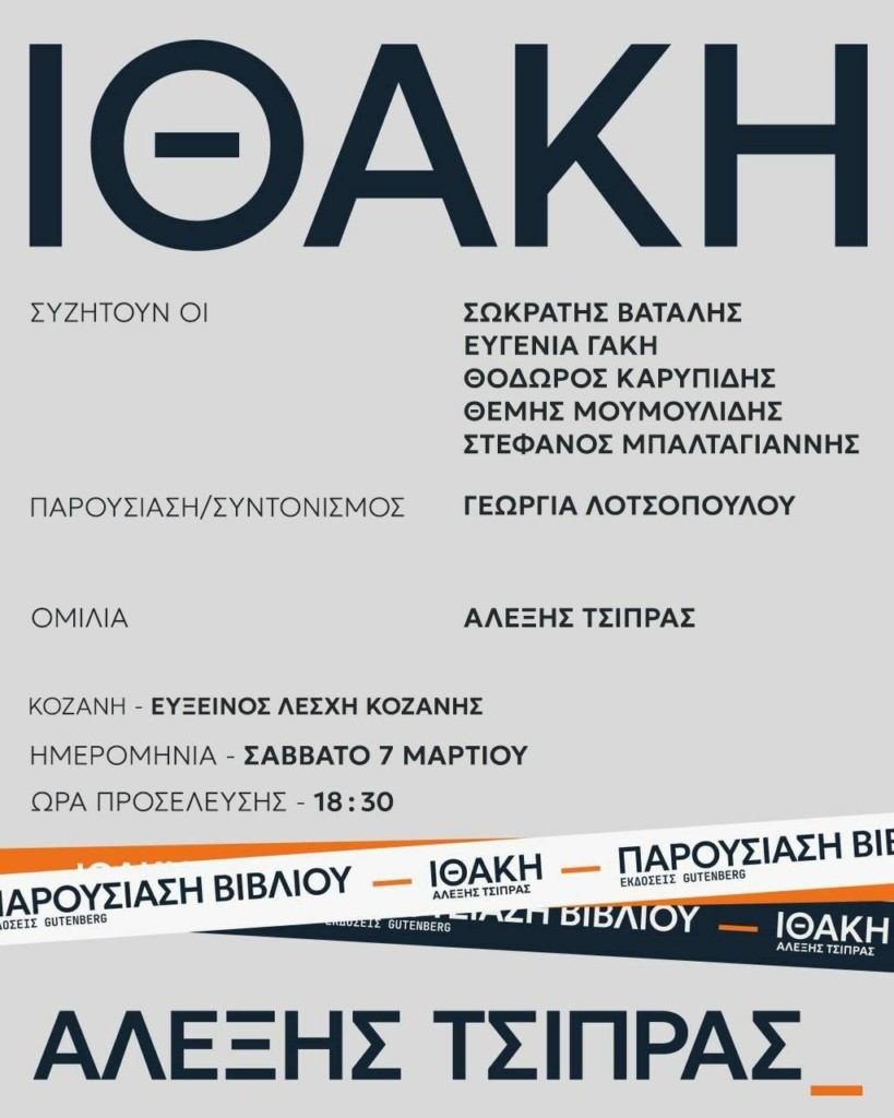 Το βιβλίο του Αλέξη Τσίπρα, με τίτλο «Ιθάκη», συνεχίζει την περιοδεία του με επόμενο σταθμό την Κοζάνη.