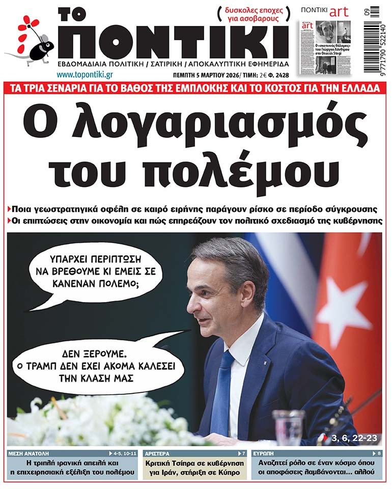 Με πρωτοσέλιδο τίτλο «ο λογαριασμός του πολέμου» και αναλυτικό – αποκαλυπτικό ρεπορτάζ για τα γεωπολιτικά οφέλη σε καιρό ειρήνης που παράγουν ρίσκο σε περίοδο σύγκρουσης, αλλά και για τις επιπτώσεις στην οικονομία και πώς επηρεάζουν τον πολιτικό σχεδιασμό της κυβέρνησης, κυκλοφορεί το «ΠΟΝΤΙΚΙ» το πρωί της Πέμπτης.