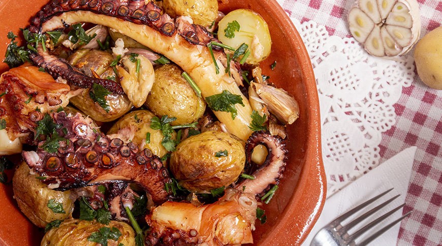 Ο συνδυασμός με πατάτες baby, μαλακές εσωτερικά και τραγανές απέξω, δένει υπέροχα με το ελαφρώς σοταρισμένο χταπόδι και απογειώνεται με το ελαιόλαδο που είναι αρωματισμένο με σκόρδο και μαϊντανό.
